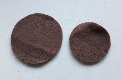Cut out the base and centre of the flower in brown felt. The base is 6cm and the inner 4.5cm, this will make a flower approximately 16cm in diameter.