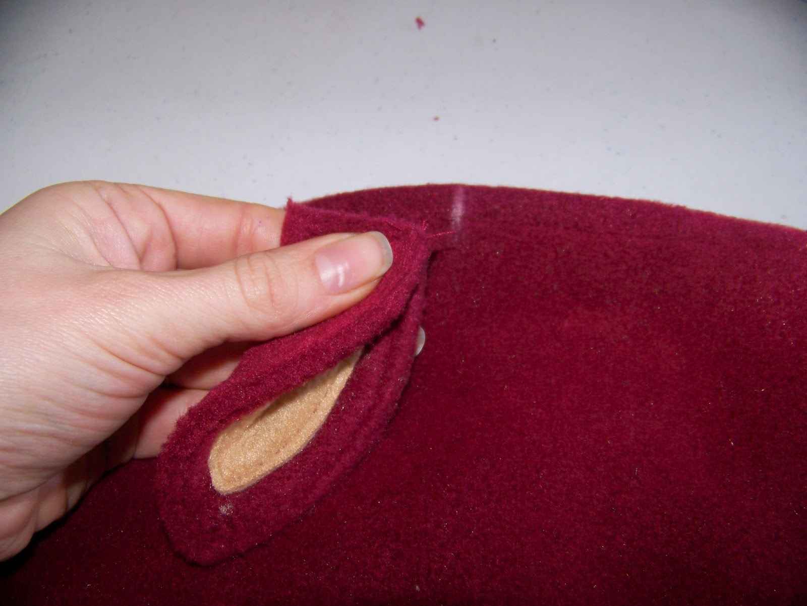Fold the base of the ear in half and slip into the underside of the hood about 16cm from the front. The 'open' side of the fold should be facing the front of the hood. This way when you turn it the right way round it should still be facing the front. Check this once you have finished pinning, before you sew.